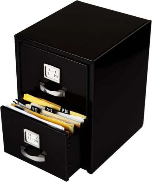 A sturdy, lockable metal filing cabinet with two full-suspension drawers for letter or legal-sized hanging folders, providing secure and organized document storage.