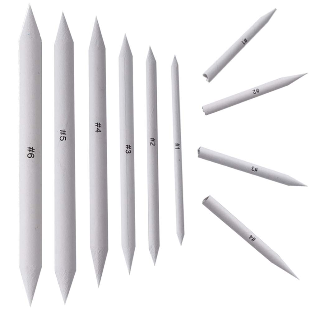 Tightly rolled paper sticks with pointed ends, used to smudge and blend graphite, charcoal, and pastel. They allow for smooth gradations and soft shading, creating subtle transitions and realistic textures in drawings.