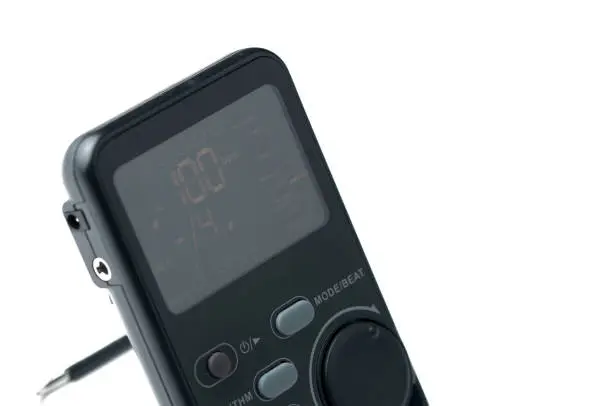 A compact, battery-powered digital metronome with a clear visual flash and adjustable audible click. Features a wide range of tempos (BPM) and time signatures to help musicians develop precise timing and rhythm during practice.