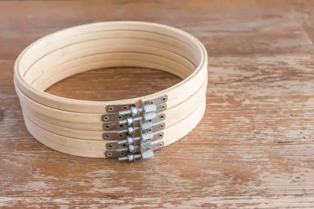 A set of wooden or plastic hoops in different sizes used to stretch fabric taut for hand embroidery. Essential for keeping work stable and even while stitching decorative patterns with thread or floss.