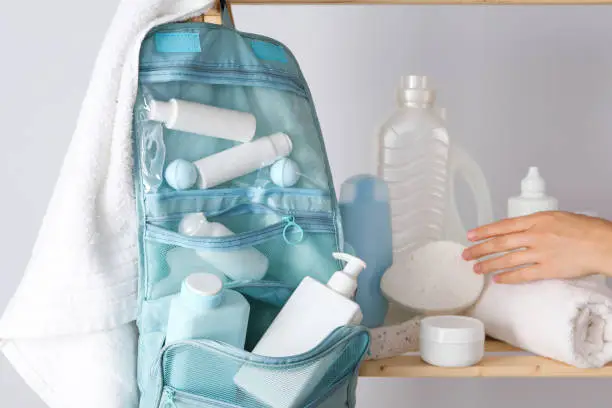 A toiletry bag with a hook, allowing it to hang from a door or towel rack. Features multiple compartments and clear pockets for easy visibility and organization of all your toiletries and cosmetics.