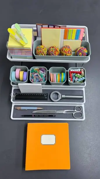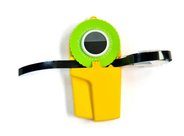A portable electronic label maker with a QWERTY keyboard and LCD screen, allowing you to print on adhesive tape for organizing files, bins, shelves, and cords professionally.