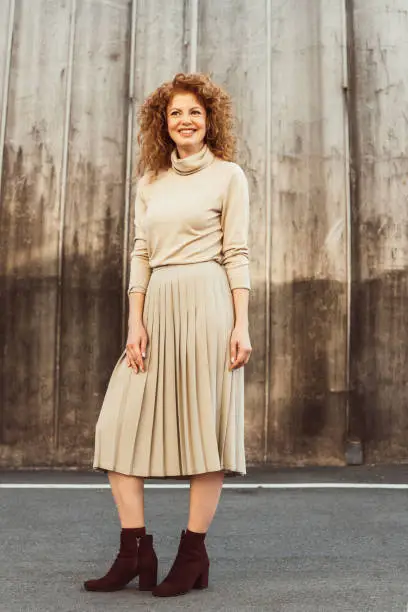 An elegant pleated midi skirt that falls to a flattering length, designed for formal occasions and office wear, offering movement and sophistication that pairs beautifully with heels and tailored blouses.