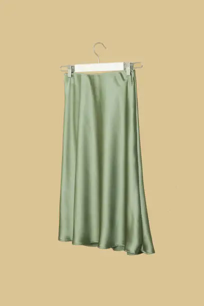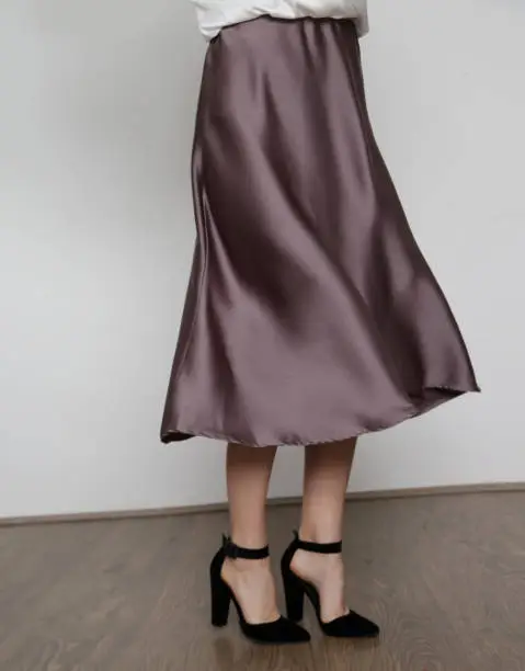 An elegant satin slip midi skirt with a luxurious sheen and fluid movement, designed to pair with simple tops or blouses for a chic evening look or a sophisticated daytime outfit.