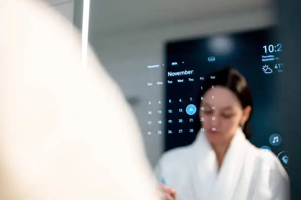 A sleek mirror with an integrated display that shows the time, weather, news headlines, and your calendar while you get ready, blending seamlessly into your decor.